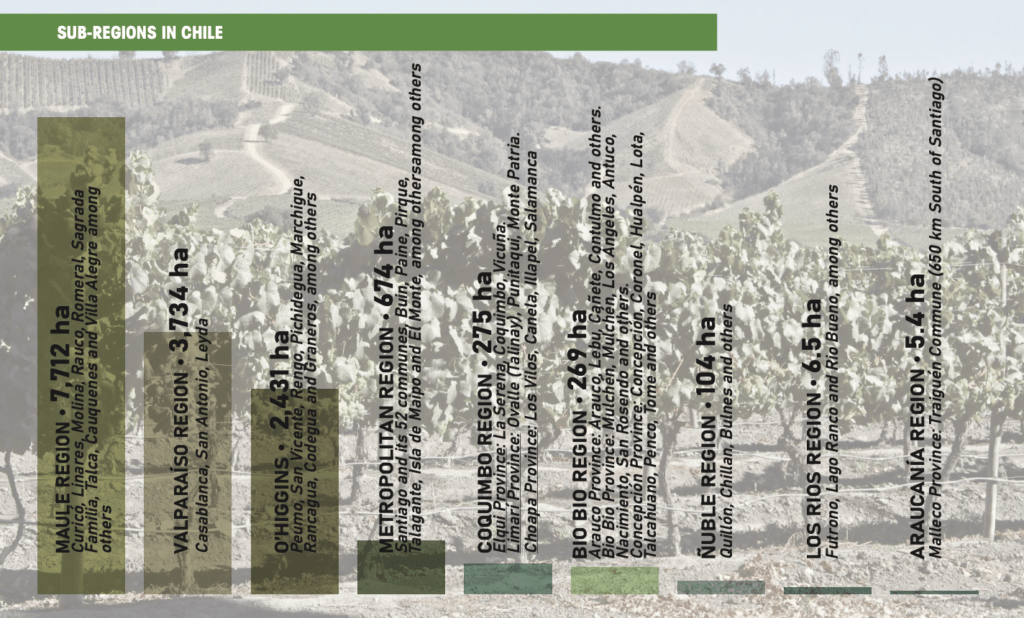 This region produces the largest amount of Sauvignon blanc in Chile (7,712 ha) and its diverse weather patterns and soils pave the way for a wide range of styles. However, high yielding vines produce less interesting wines or wines with less varietal typicity and a large share of them are bound for domestic consumption. As part of the search for even cooler climates, Sauvignon blanc can also be found in the far South of Chile. Vineyards in the Araucanía region, Malleco (Traiguén) and Los Ríos region (Lago Ranco) deserve a mention and a brief description.